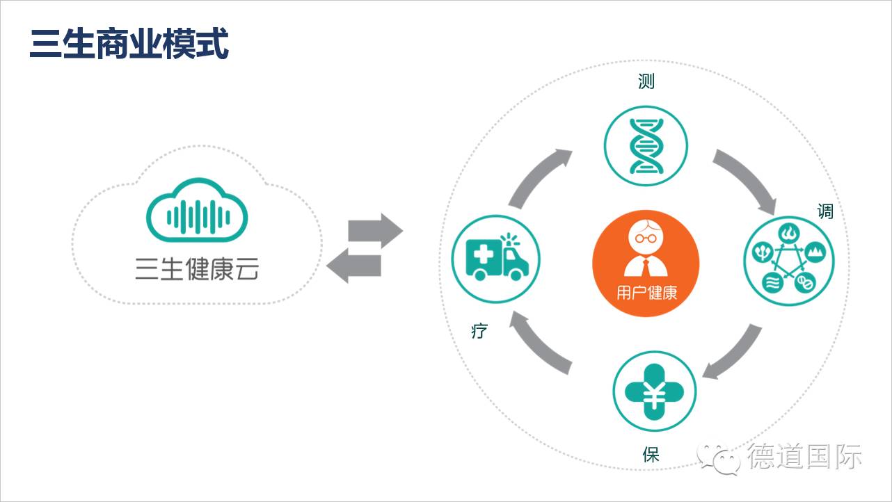 大健康产业的市场非常巨大,包括了医疗产品、医疗器械、康复理疗、家居养老、健康咨询、健康管理、健康服务、健康保险、保健食品、营养食品等等。这些大健康产业的细分市场 就像一颗颗珍珠,任何一家企业想一家独大、全部做完,基本不可能。而三生清晰地看到了自身的优势和核心竞争力。三生就像一条金线把这些明珠都串起来,形成一条链,有价值的链,实行互惠共利。三生将以基因检测为基础,以中医药养生为理念,以高科技的产品为核心,以健康保险为保障,以医疗服务来持续守护消费者的健康和未来!