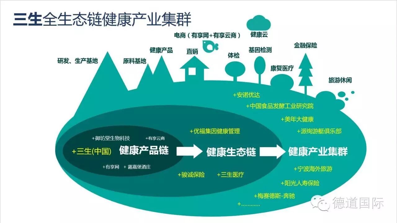 我们今天是要告诉所有的三生家人,我们三生未来的大布局,我们将形成一个可持续、全生态的商业模式闭环。它意味着三生要从一家提供衣食住行的健康产品企业,升级为全生态链健康产业集群。